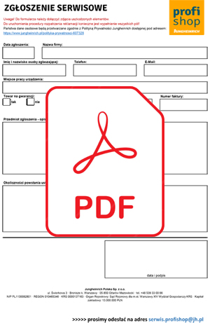Dokumentację zdjęciową oraz wypełniony formularz należy przesłać na adres serwis.profishop@jh.pl. Wózki akumulatorowe oraz elektryczne stoły nożycowe są naprawiane na miejscu u Klienta, pozostałe artykuły w naszym Warsztacie Centralnym.